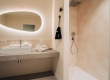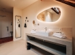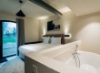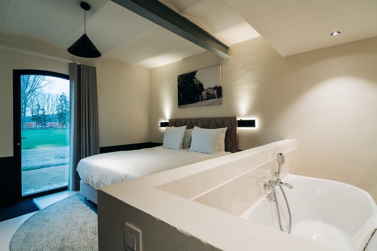 De ruime, stijlvolle Wellness suites (50 m²) hebben uitzicht op de tuin en zijn voorzien van sauna, terras, 1 tweepersoonsbed, zithoek, televisie, wifi, bureau, kluisje, koffie- en theefaciliteiten, koelkast, airconditioning, verwarming, kast, badjassen, slippers en badkamer met inloopdouche, bubbelbad, toilet, wastafel, haardroger en gratis toiletartikelen.