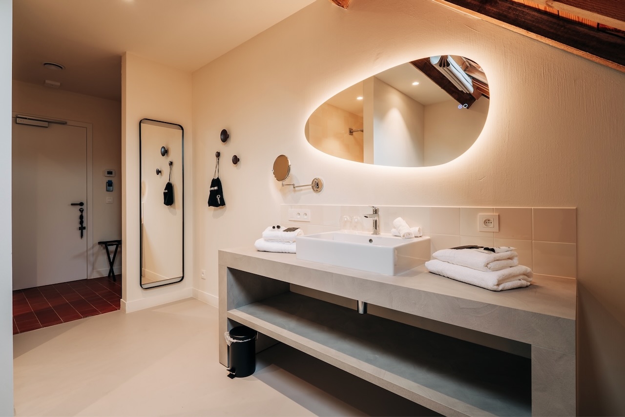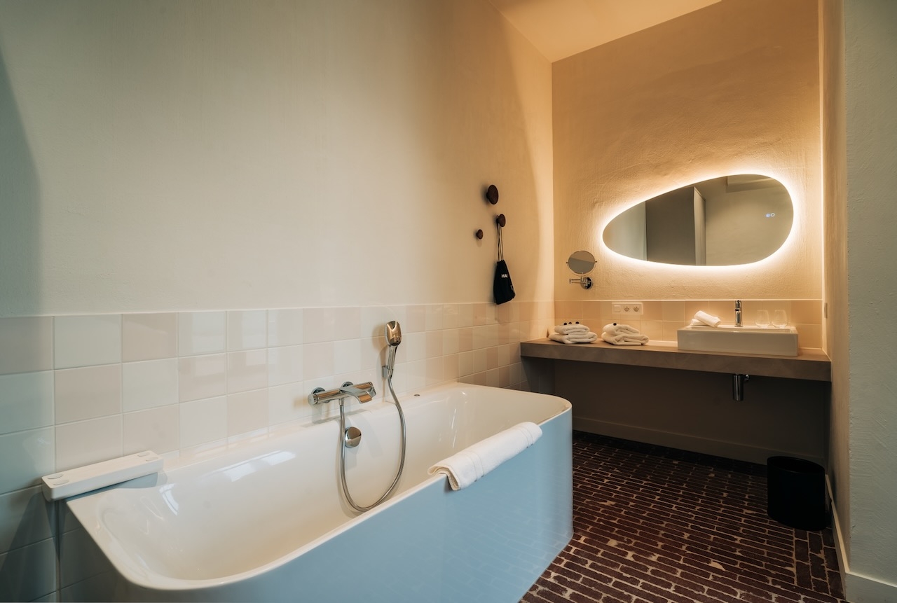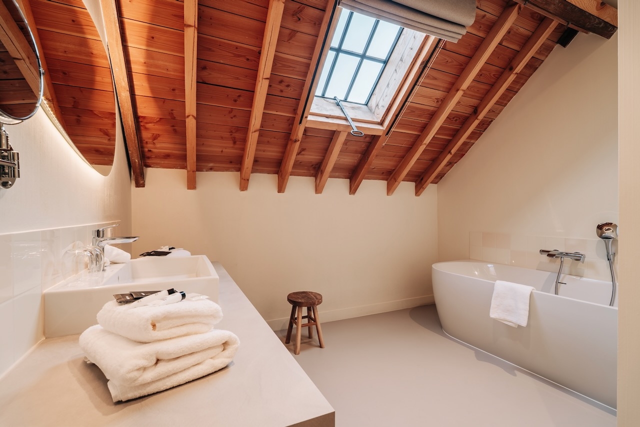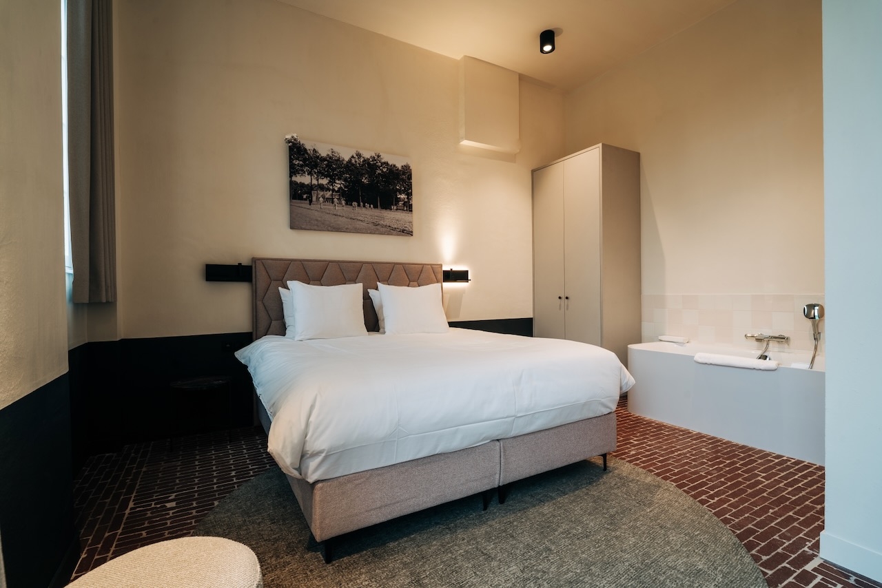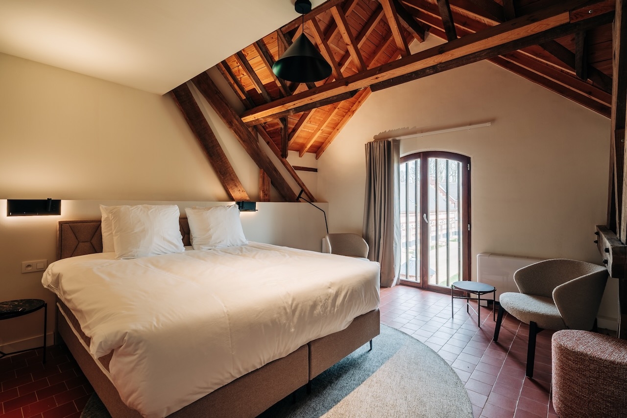 De ruime, stijlvolle Junior suites (45 m²) hebben uitzicht op de tuin of de binnenplaats en zijn voorzien van 1 tweepersoonsbed, zithoek, televisie, wifi, bureau, slaapbank, kluisje, koffie- en theefaciliteiten, koelkast, airconditioning, verwarming, kast en badkamer met inloopdouche, bad, toilet, wastafel, haardroger en gratis toiletartikelen.