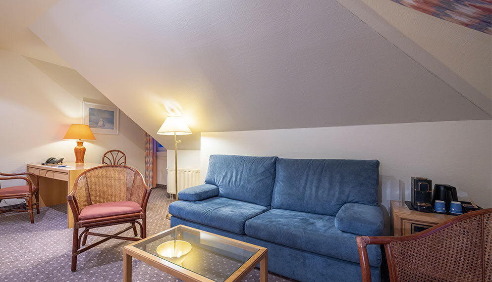 De zeer ruime Suite (60 m2) is voorzien van 1 tweepersoonsbed, bureau, kluis, televisie, wifi, make-up spiegel, slaapbank en badkamer met douche en/of bad, toilet, wastafel en haardroger.