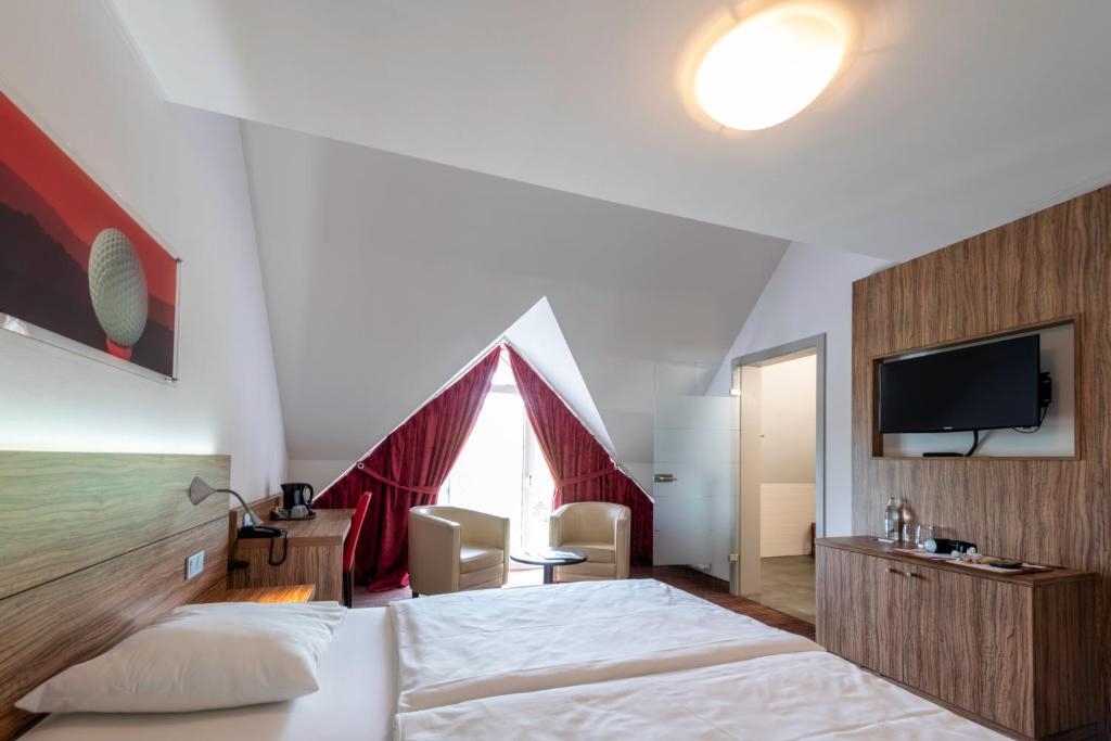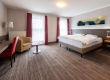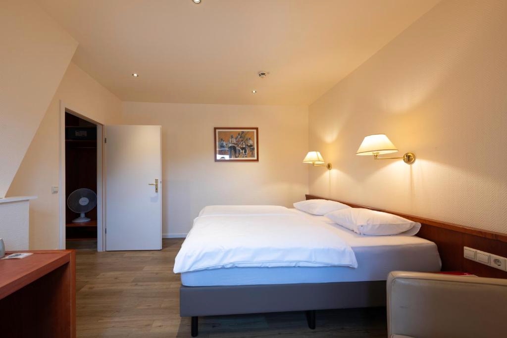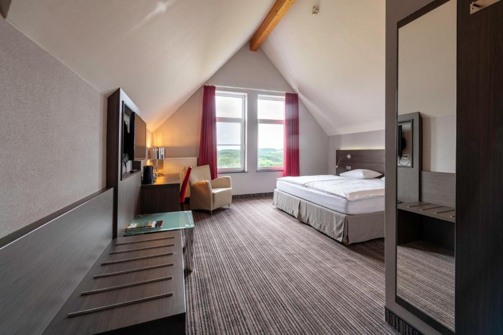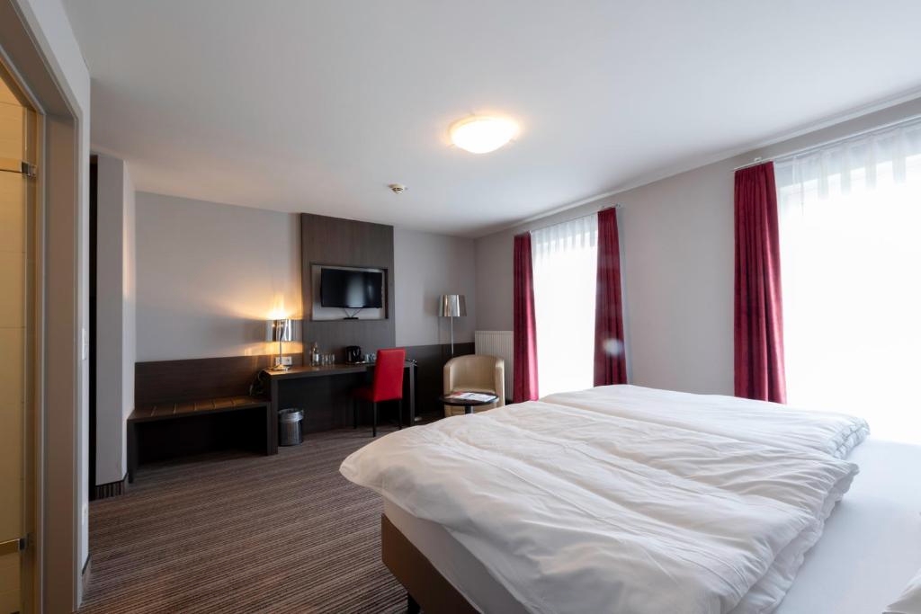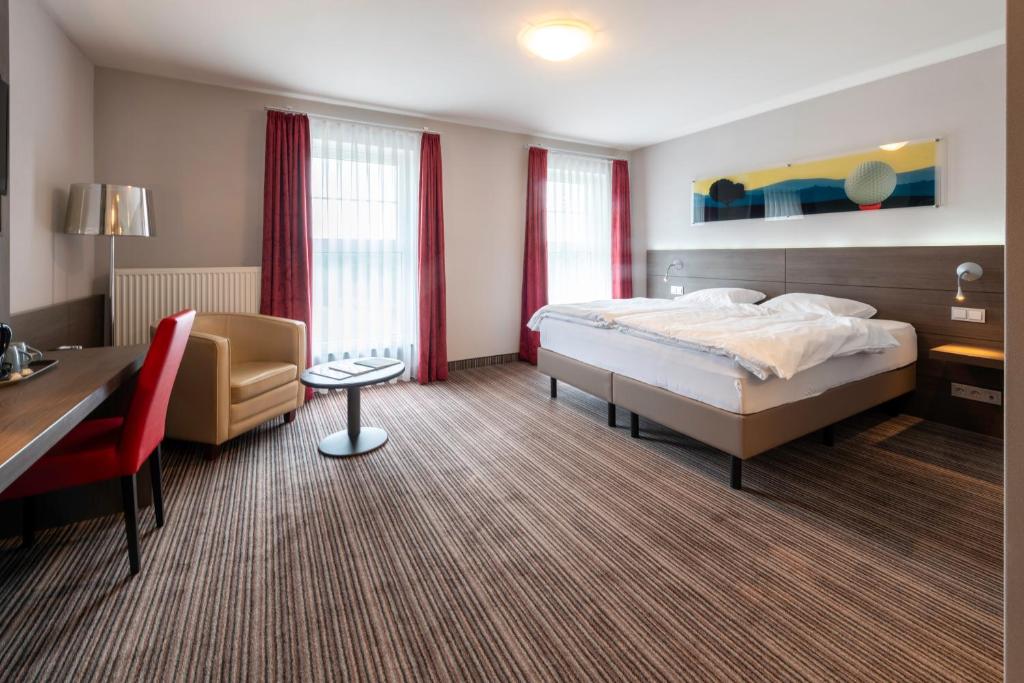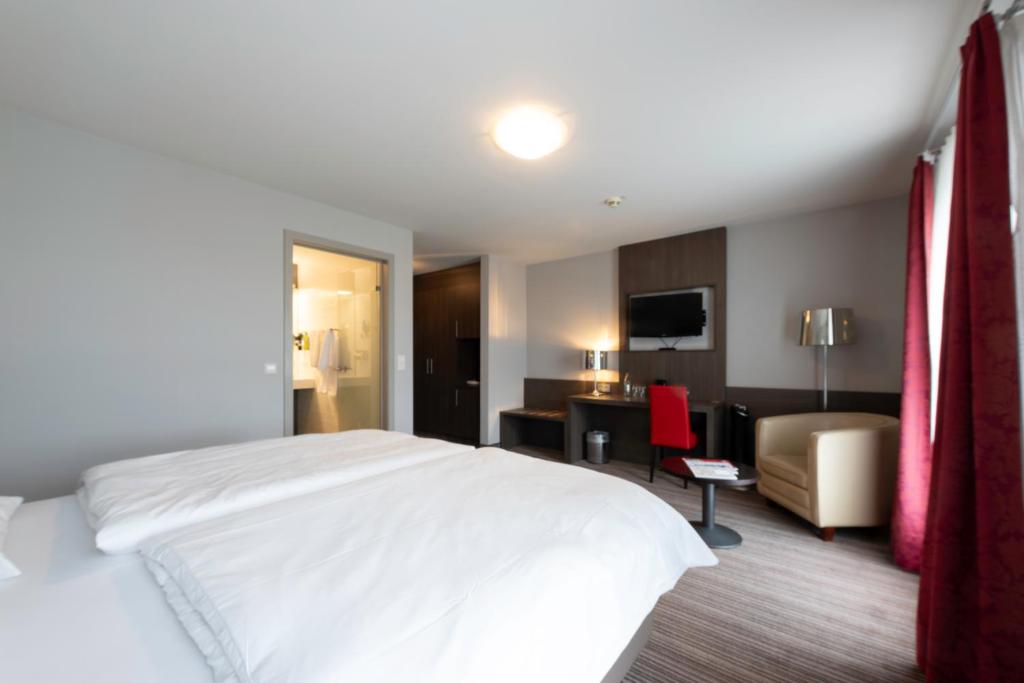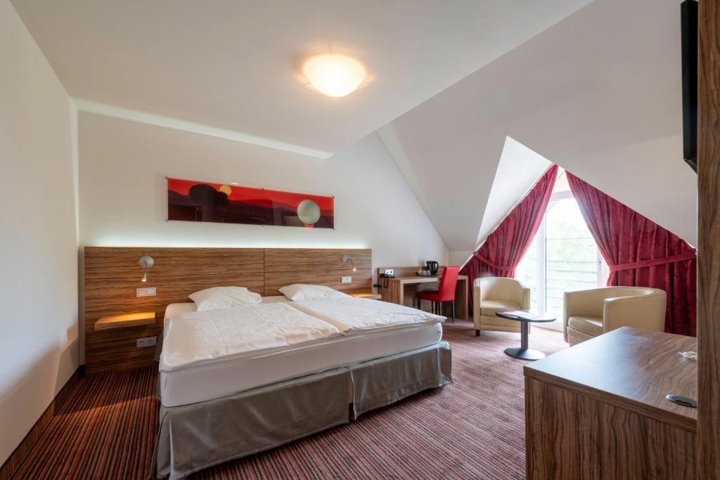De ruime Comfort kamers (29 m²) bieden uitzicht op de omgeving en zijn voorzien van 1 tweepersoonsbed, flatscreen televisie, wifi, zithoek, bureau, koffie- en theefaciliteiten, kluisje, koelkast, verwarming, ventilator en badkamer met bad/douche combinatie, toilet, wastafel, haardroger en gratis toiletartikelen.