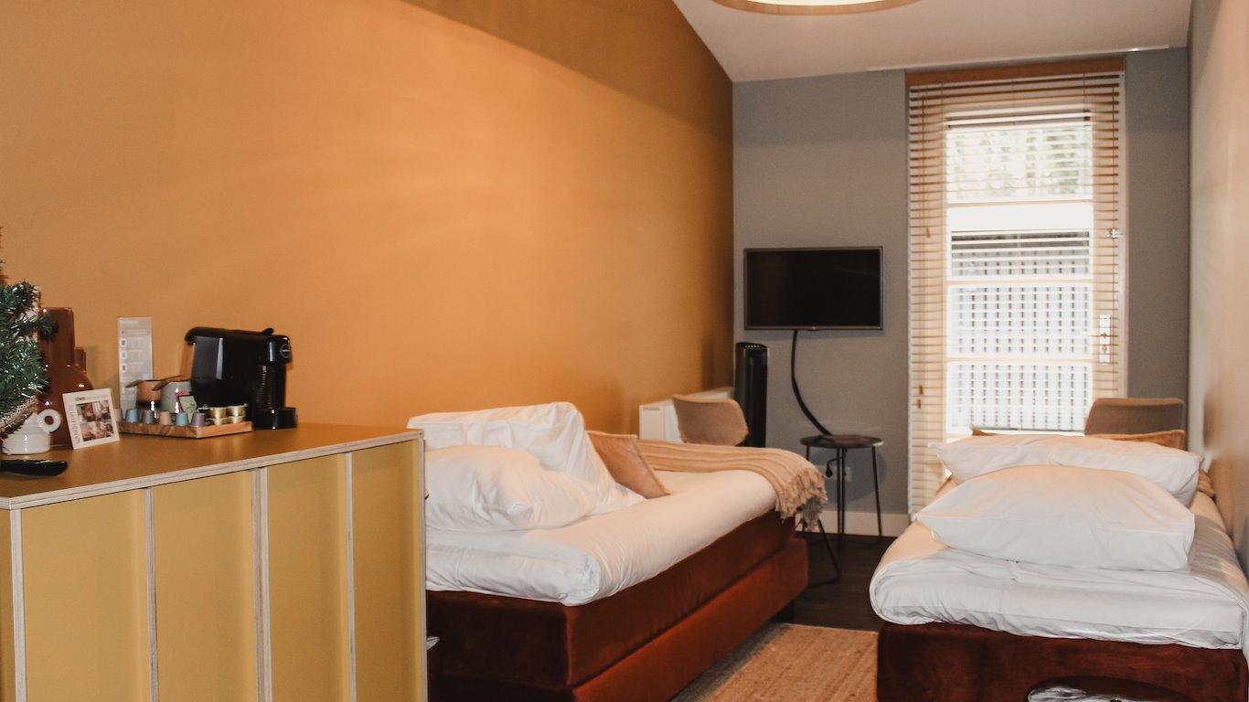 Deze Economy kamers (20 m²) liggen op de begane grond, bieden uitzicht op de binnenplaats en zijn voorzien van 2 eenpersoonsbedden, flatscreen televisie, gratis wifi, zithoek, bureau, terras, telefoon, verwarming, koffie- en theefaciliteiten en badkamer met regendouche, toilet, wastafel, haardroger en gratis toiletartikelen.