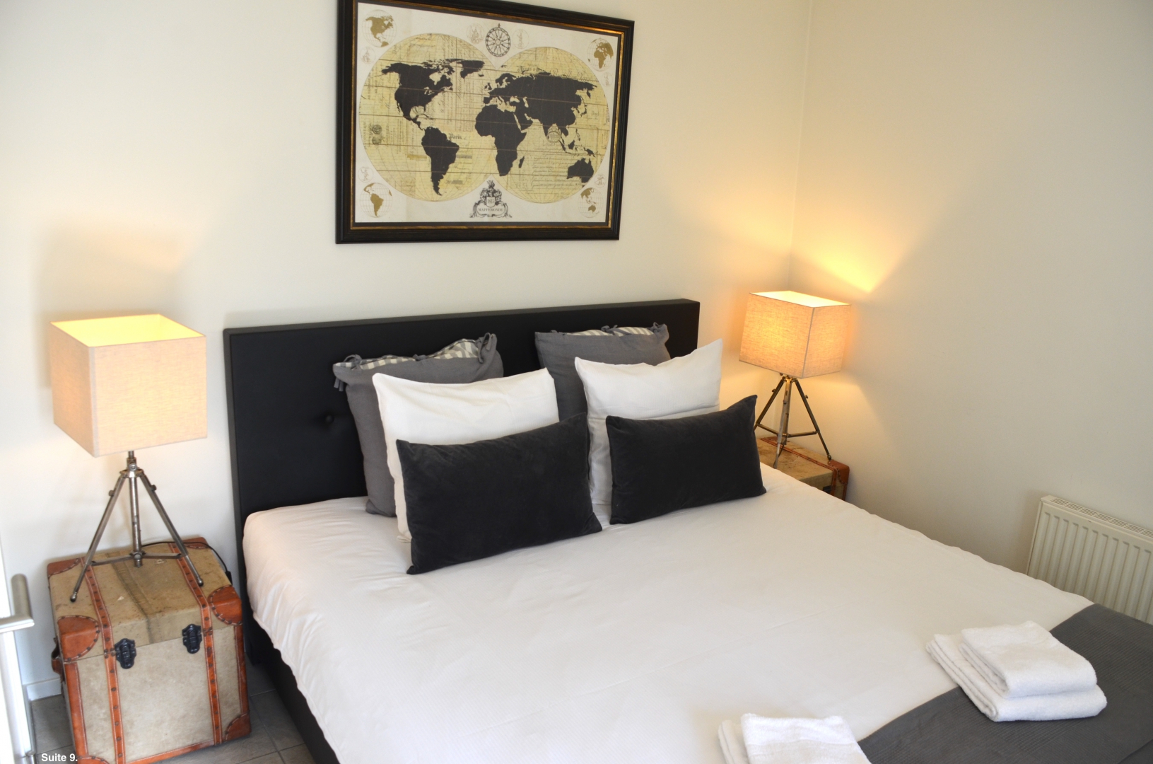 De Suite met de jet-stream massage design douche ligt op de tweede etage aan de achterzijde en is voorzien van een Kingsize (tweepersoons) bed en tweepersoons hypo-allergeen dekbed met kussens en bedlinnen van gekamd katoen, gratis WiFi, 32 inch SMART-TV, kleine koelkast, koffie/thee faciliteiten, luxe Leoluxstoelen, glossy magazine, comfortabele badjassen en en-suite badkamer met 100% transparante glaswanden, design douche met meerdere jet-stream douchekoppen, wastafel, design toilet en verzorgingsartikelen.